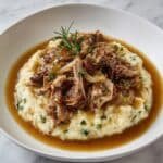 This Apple Cider Pork Roast is a tender, flavorful dish featuring a bone-in pork shoulder braised in a savory blend of apple cider, chicken broth, white wine, fresh herbs, and honey mustard. The slow cooking process results in a fall-apart tender roast complemented by soft, sweet-tart apples, perfect for a comforting dinner served alongside mashed potatoes or your favorite sides.