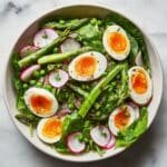 A fresh and vibrant asparagus salad topped with soft-boiled eggs and a tangy lemon Dijon dressing. Perfect as a light lunch or side dish, this salad combines tender-crisp asparagus, peas, leafy greens, and crunchy radishes for a delightful mix of textures and flavors.