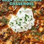 A comforting Beef Stroganoff Casserole combining ground beef, sautéed mushrooms, and onions in a creamy mushroom sauce, layered with tender egg noodles and topped with crispy fried onions for a delightful texture and flavor.