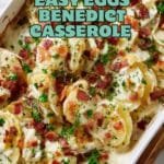 This Easy Eggs Benedict Casserole is a delicious and effortless twist on the classic brunch favorite. Layers of English muffins, Canadian bacon, and cheddar cheese are soaked in a flavorful egg mixture, baked to perfection, and topped with rich hollandaise sauce and fresh herbs for a crowd-pleasing breakfast or brunch dish.