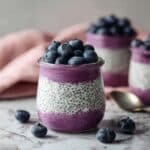 A delicious and healthy Blueberry Chia Seed Pudding made with vegan ingredients, packed with antioxidants and omega-3s. This easy no-cook recipe combines chia seeds soaked in plant-based milk with creamy blueberry-infused vegan yogurt and fresh blueberries on top for a refreshing and nutritious breakfast or snack.