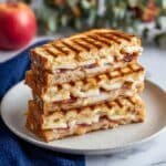 A warm and indulgent panini combining creamy Brie cheese, crispy bacon, sweet apple slices, and a drizzle of honey, grilled to perfection on your favorite bread for a deliciously satisfying sandwich.