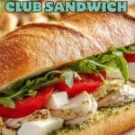 This chicken club sandwich balances textures and flavors in a way that feels both hearty and fresh — every bite melts in your mouth with soft mozzarella and crisp bread, punctuated by the vibrant, nutty pesto and peppery arugula.