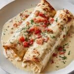 Delicious and creamy Chicken Enchiladas with a tangy sour cream white sauce, filled with shredded chicken, cheese, and green chiles, then baked to bubbly perfection and topped with fresh tomatoes and cilantro for a flavorful Mexican-inspired meal.