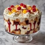 A classic British dessert featuring layers of sponge cake soaked with sherry or fruit juice, fresh mixed berries, smooth custard, and fluffy whipped cream, topped with slivered almonds and fresh berries. Perfect for a festive occasion or a delightful treat.