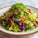 This Crunchy Asian Cabbage Slaw features a vibrant mix of green and red cabbage, carrots, and green onions tossed in a flavorful, addictive sesame dressing. The dressing combines toasted sesame oil, low sodium soy sauce, rice vinegar, honey, fresh garlic, ginger, and Dijon mustard for a perfect balance of tangy, sweet, and savory notes. Topped with toasted sesame seeds, this slaw is refreshing, crunchy, and perfect as a side dish or light snack served chilled or at room temperature.