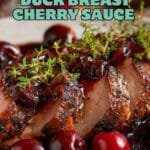 - Serve: Slice the rested duck breasts thinly and arrange on plates. Drizzle the warm cherry sauce over the top and garnish with fresh thyme. Serve alongside roasted potatoes or a fresh salad for a complete meal.