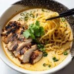 Fiery Chicken Ramen is a comforting noodle bowl featuring spicy marinated chicken strips, creamy garlic sauce, and tender ramen noodles, topped with fresh green onions, shredded carrots, and a soft-boiled egg for a perfect balance of heat and creaminess.