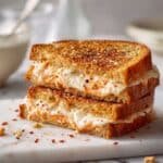 A delightful twist on the classic grilled cheese sandwich featuring creamy goat cheese, shredded white cheddar, a hint of spicy red pepper flakes infused in butter, and a sweet drizzle of honey for a perfect balance of flavors.