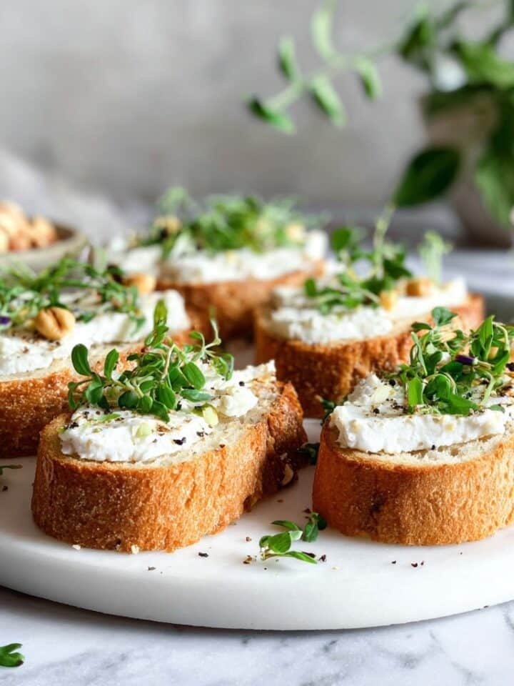 These crostini are best enjoyed fresh, but if you have leftovers, store the toasted baguette slices separately in an airtight container for up to 2 days to keep them crisp. The herbed goat cheese mixture can be refrigerated for up to 3 days. When ready to serve again, spread the chilled cheese on room-temperature crostini. Avoid reheating to maintain the crostini’s perfect crunch and the cheese’s creaminess.
