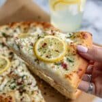 This bright and refreshing Lemon Pizza features a crispy no-knead dough topped with a zesty lemon brine, fresh mozzarella, and finished with Parmesan and parsley. It's a perfect spring or summer pizza that's light yet flavorful, combining creamy cheese and tangy citrus for a unique twist on classic pizza.