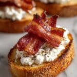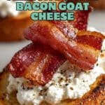 This Million Dollar Bacon Goat Cheese Appetizer Log features crispy, sweet and spicy candied bacon paired with creamy goat cheese atop crostini. The bacon is baked to perfection with a brown sugar and spice glaze, then served with crunchy toasted baguette slices and drizzled with maple syrup or honey for a deliciously indulgent appetizer.