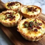 Delightful mini quiches featuring flaky pie crusts filled with a creamy egg and heavy cream custard, loaded with cheese, vegetables, and optional savory bacon or sausage. Perfect as a versatile appetizer or snack served warm or at room temperature.