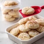 - Shape and Coat Dough Balls: Using a teaspoon or a 1-teaspoon cookie scoop for a heaping portion (about 2 teaspoons of dough), scoop dough balls and place them into the sugar container in batches of 8-10. Gently toss or shake to coat the dough balls evenly with sugar.