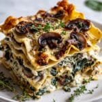 A hearty and flavorful Mushroom and Spinach Lasagna featuring layers of tender noodles, sautéed mushrooms, fresh spinach, ricotta, and melted mozzarella cheese baked to golden perfection.