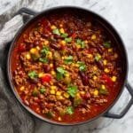 A hearty and flavorful one-pot beef and vegetable chili made with ground beef, beans, and tomatoes, packed with spices and perfect for a comforting meal.