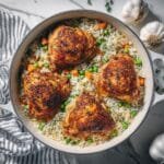 A comforting one-pot chicken and rice recipe featuring tender chicken thighs simmered with aromatic spices, vegetables, and long-grain rice for a hearty and easy meal.