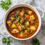 A hearty and comforting one-pot chicken and vegetable stew made with tender chicken thighs, fresh vegetables, and aromatic herbs simmered to perfection in a savory chicken broth.
