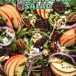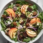 A refreshing Apple Arugula Salad featuring thinly sliced apples, peppery arugula, sweet figs, tangy goat cheese, and homemade maple-glazed pecans, all tossed with a flavorful balsamic maple dressing. Perfect as a light lunch or a sophisticated side dish.