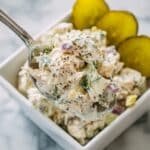 This Savory Dill Pickle Chicken Salad offers a tangy, creamy twist on classic chicken salad with shredded chicken, dill pickles, red onion, and a flavorful Greek yogurt and mayonnaise dressing enhanced by fresh herbs and Dijon mustard. Perfect for sandwiches, crackers, or lettuce cups, it's a versatile and delicious meal option.
