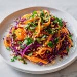 A vibrant and refreshing shaved rainbow carrot salad tossed with fresh herbs and a flavorful sesame dressing, perfect as a light side dish or appetizer.