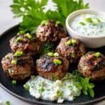 Once the meatballs are golden and cooked through, it’s time to blend your creamy green herb dip. Toss avocado, yogurt, garlic, herbs, lemon juice, salt, and pepper into a blender and whirl into a velvety sauce—you can keep it a little chunky if that’s your vibe. Don’t be shy with tasting and tweaking the seasoning; the dip should be bright and tangy to balance the spicy lamb. Serve those juicy meatballs right away with a generous spoonful or two of that dreamy green dip, and maybe a sprinkle of chili flakes or fresh herbs for that final pop.