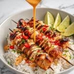 This Sweet Chili Chicken Bowl with Coconut Lime Drizzle offers a flavorful combination of tender marinated chicken thighs served over jasmine rice, fresh tomatoes, and green onions, all topped with a creamy coconut lime sauce. It's a vibrant, easy-to-make dish perfect for a satisfying lunch or dinner.