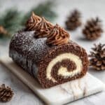 A classic French Yule Log cake featuring a light chocolate sponge rolled with vanilla whipped cream filling and topped with a rich dark chocolate ganache, perfect for festive celebrations.